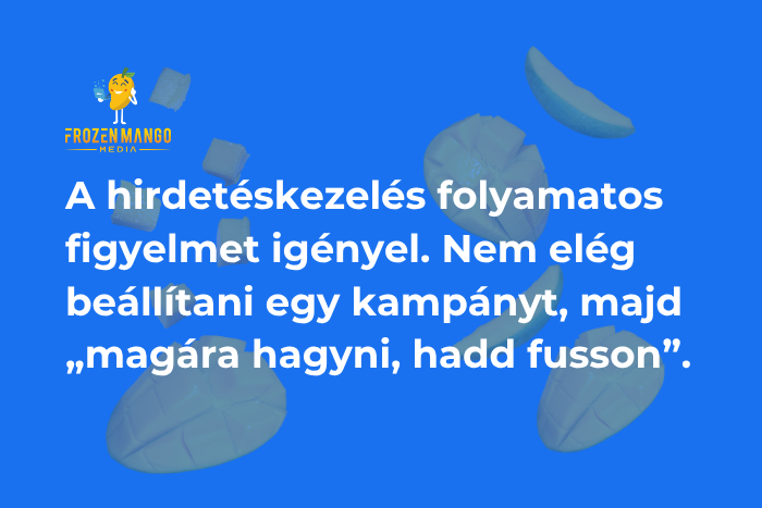 A hirdetéskezelés folyamatos figyelmet igényel. Nem elég beállítani egy kampányt, majd „magára hagyni, hadd fusson”. Tőlünk is többször kértek ajánlatot egyszeri kampányindításra, de sosem vállaltuk el, mert az szakmailag egy nagyon rossz döntés lenne, aminek hosszú távon beláthatatlan következményei lennének, és mi nem hiszünk a félmegoldásokban.