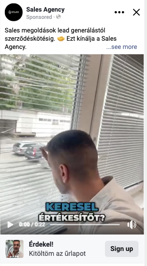 A Facebook és Instagram ökoszisztémája lehetővé teszi, hogy nagy elérés mellett pontos célzással érjük el a döntéshozókat és a potenciális ügyfeleket. A Sales Agency esetében Meta űrlapos hirdetéseket indítottunk, ahol az érdeklődők közvetlenül a platformon tudtak jelentkezni. Ez csökkenti a lemorzsolódást, hiszen nem kell átkattintani a weboldalra.