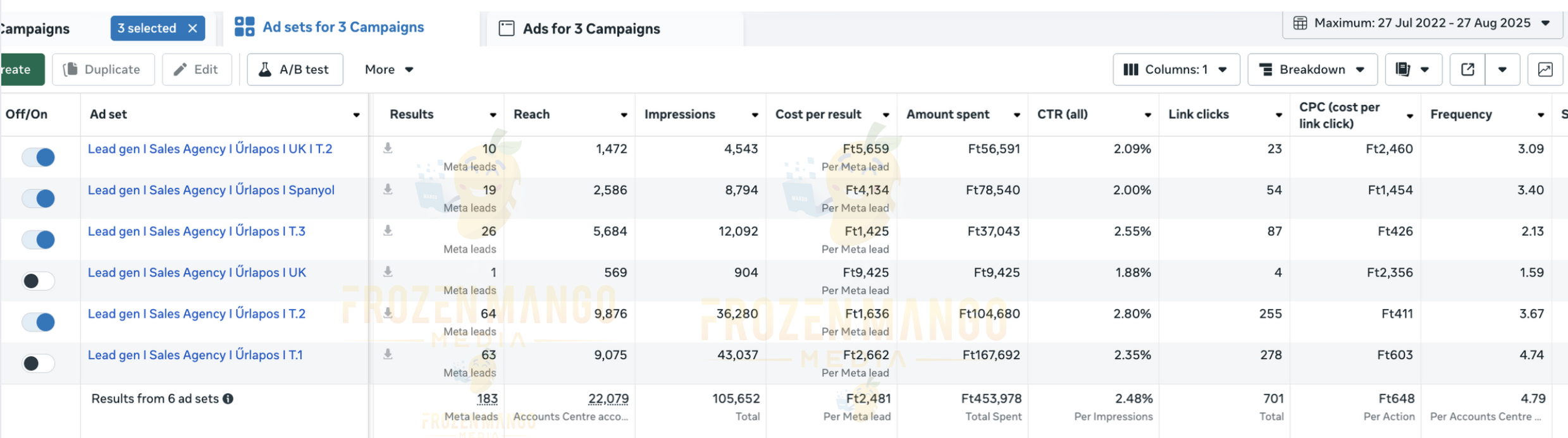2.) A/B tesztelés – mindig a legjobban teljesítő kreatívokra és szövegekre költöttünk többet, amelyek nem működtek jól, azokat kikapcsoltuk.